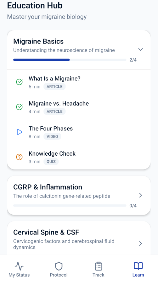 Learn about CGRP, cervical spine factors, treatment options, and take validated clinical self-assessments.