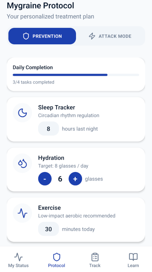 Personalized prevention tasks — sleep, hydration, exercise, and neuromodulation tracking — all in one place.